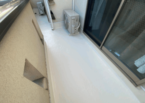 そして、最後の仕上げ塗りです。防水工事におけるトップコートの役割としては、ウレタン二層目で作った防水層の”保護”をするという役割です。 そのため隅々まで塗る必要があります。